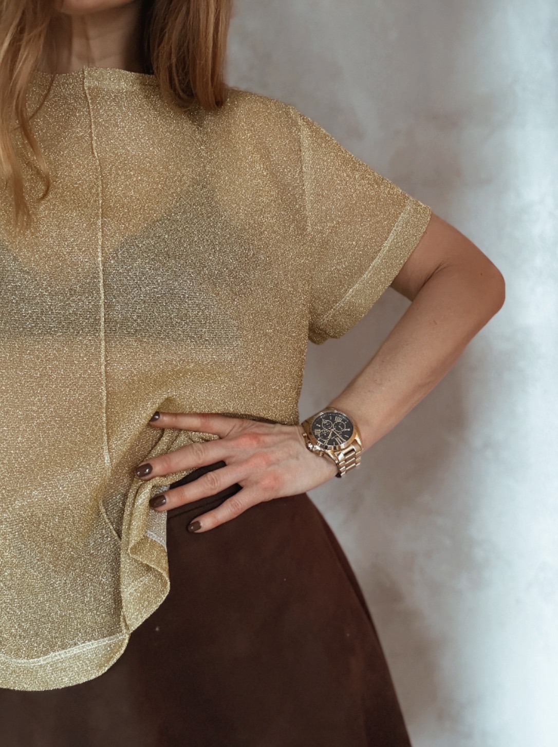 Třpytivý průhledný top s krátkým rukávem, který zaujme na první pohled. Atraktivní prošití uprostřed zvýrazňuje siluetu a dodává modelu rafinovaný detail. Perfektní volba pro výrazný, ale elegantní outfit.