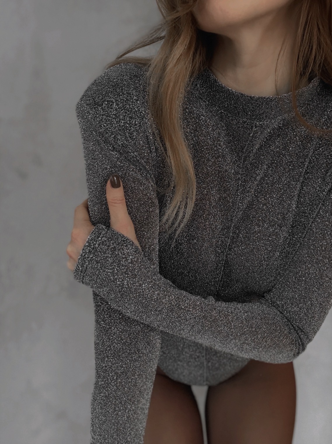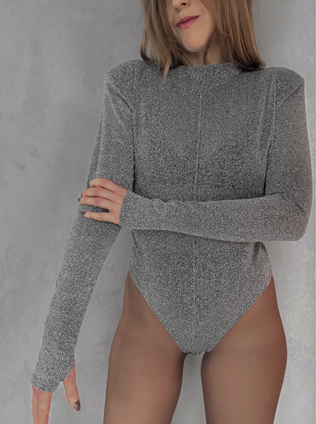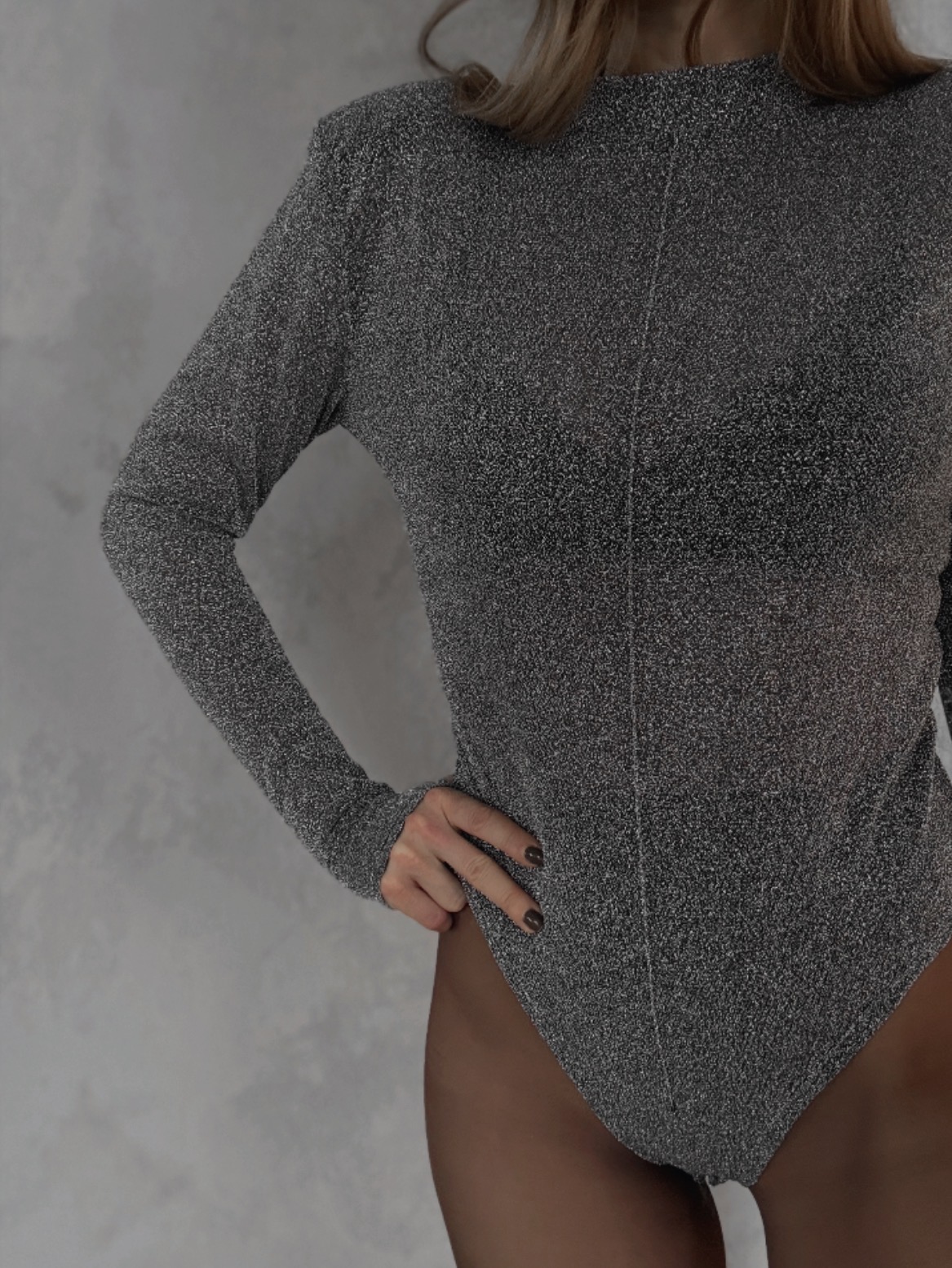 Třpytivé průhledné body, které si bereš ve chvíli, kdy chceš rozpoutat pozornost. Lehoučký materiál se smyslně leskne při každém pohybu, prošití uprostřed zvýrazňuje křivky a podtrhuje ženskou siluetu. Jemný stojáček a ramenní vycpávky dodávají modelu výrazný, sebevědomý charakter. Extra dlouhé rukávy s protažením na palec působí dráždivě a moderně – detail, který zaujme a nepustí. Body pro holky, které vědí, kdy být jemné… a kdy provokovat