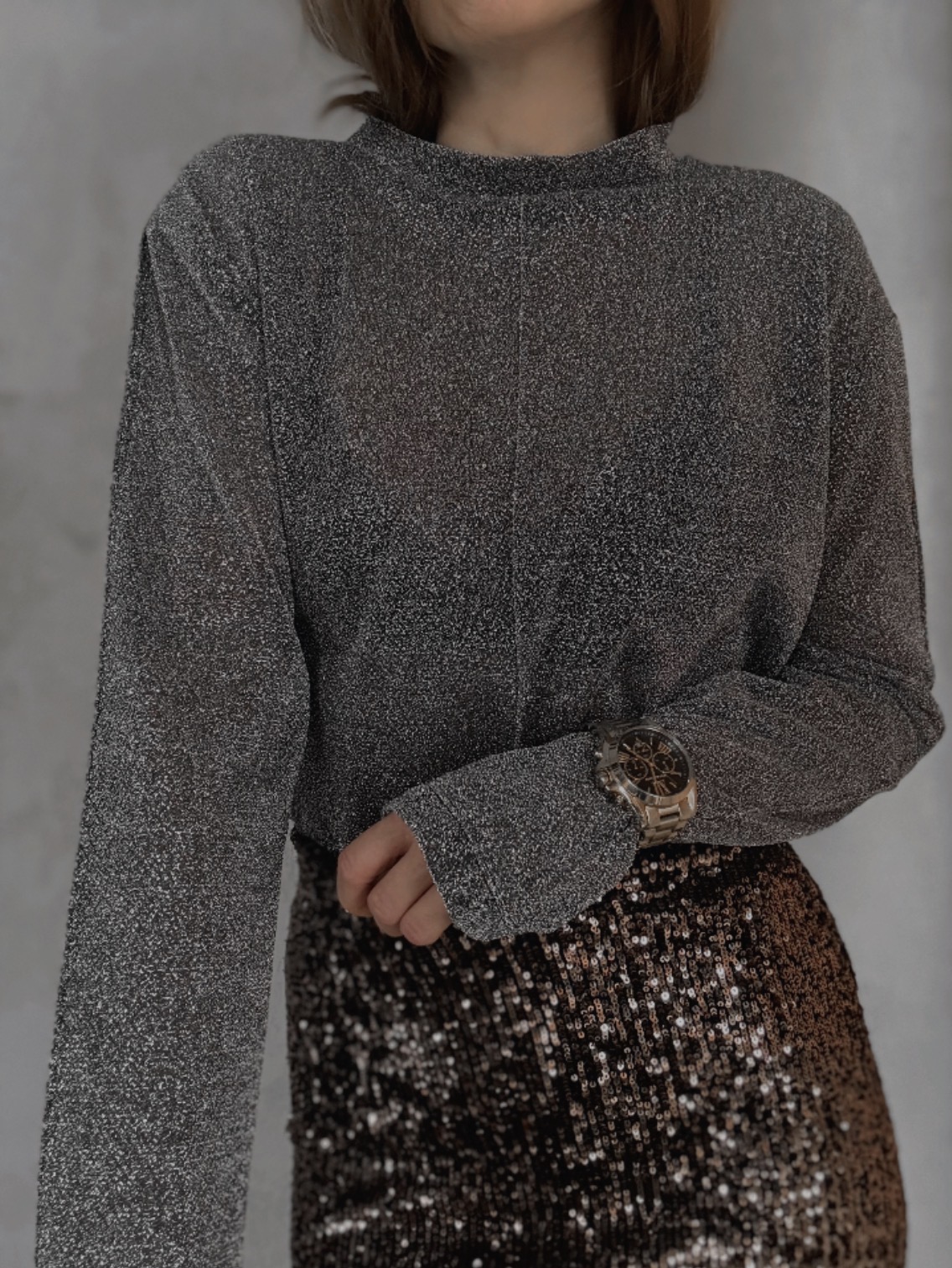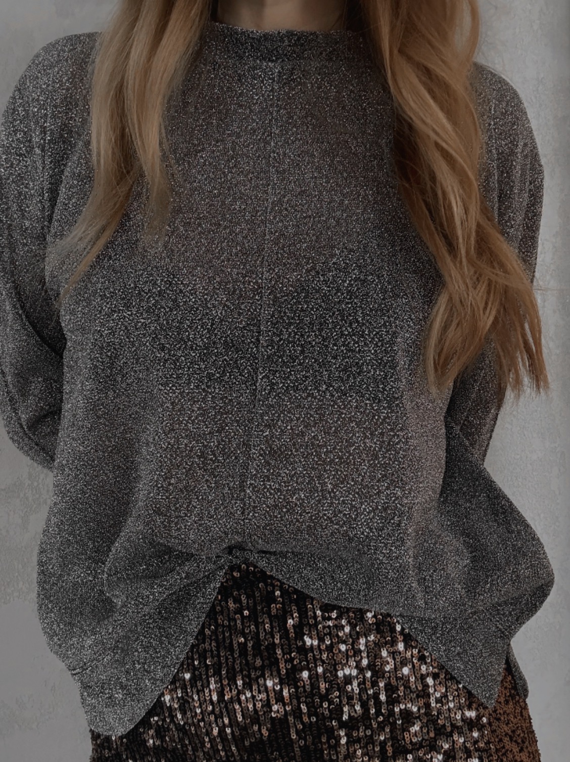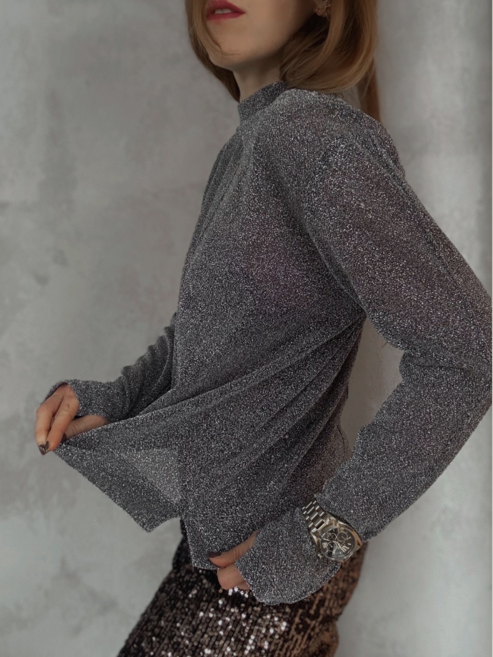 Jemně průhledný top s třpytivým efektem, který chytá světlo při každém pohybu. Extra dlouhé rukávy dodávají dramatický, módní look a prodlužují siluetu. Ideální k vrstvení i jako výrazný kousek na večer.