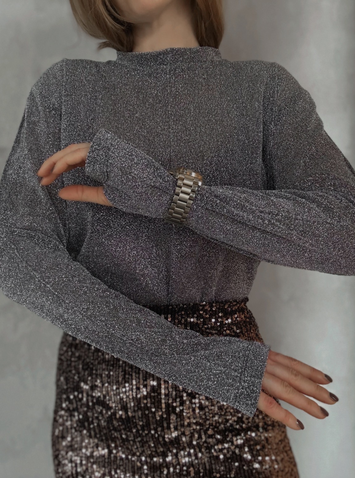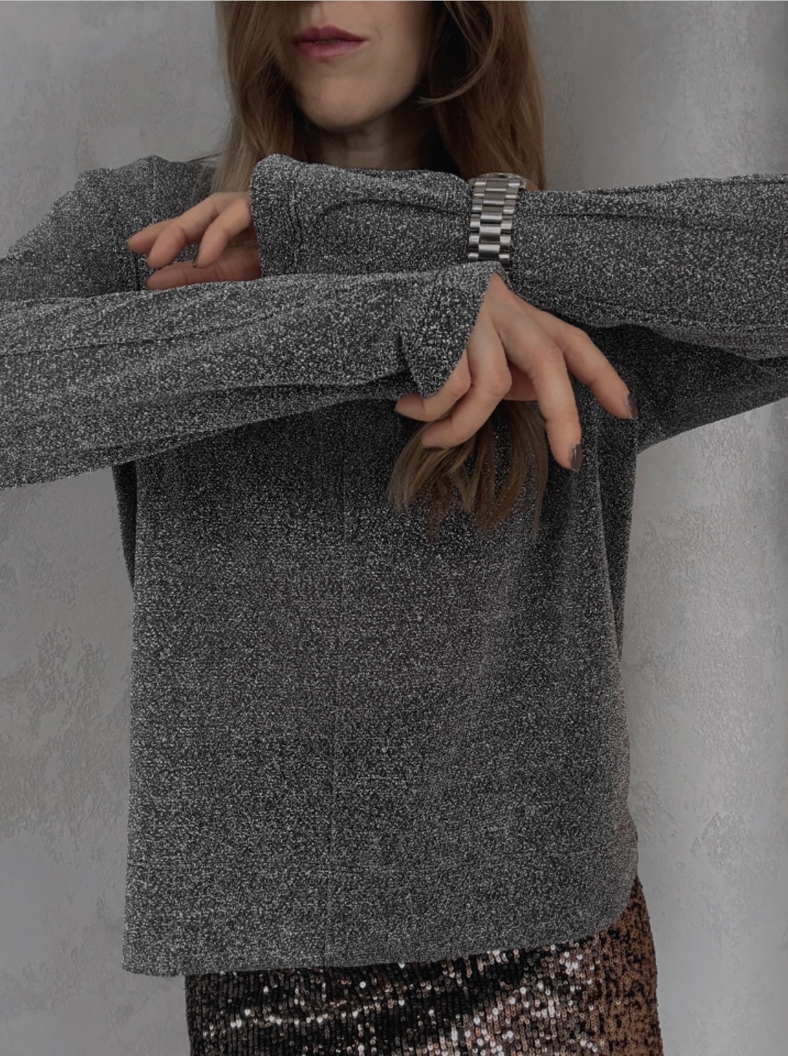 Jemně průhledný top s třpytivým efektem, který chytá světlo při každém pohybu. Extra dlouhé rukávy dodávají dramatický, módní look a prodlužují siluetu. Ideální k vrstvení i jako výrazný kousek na večer.
