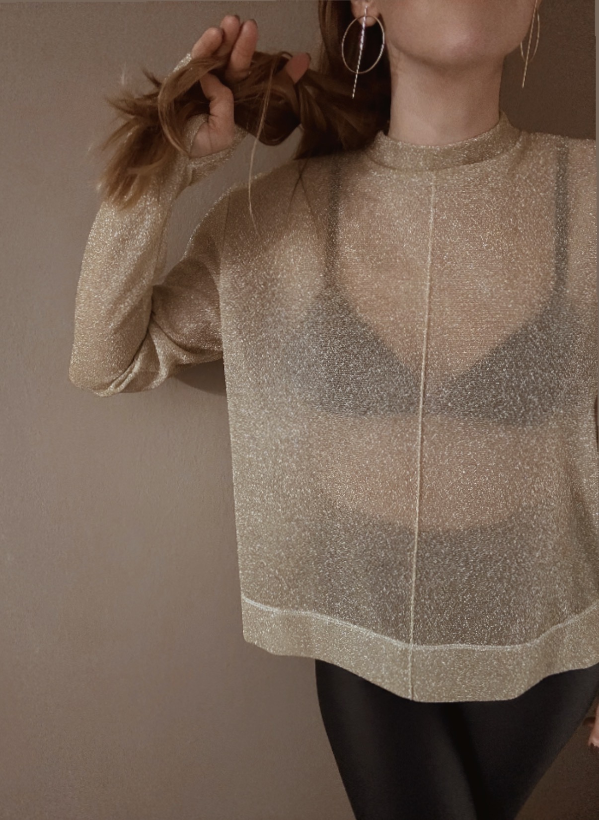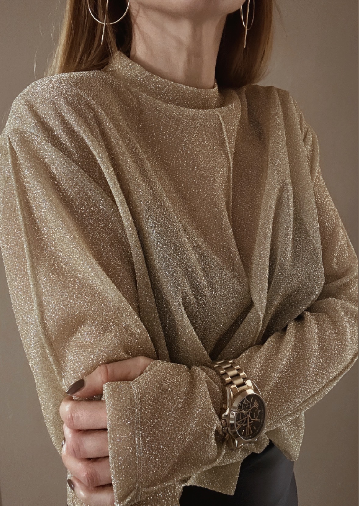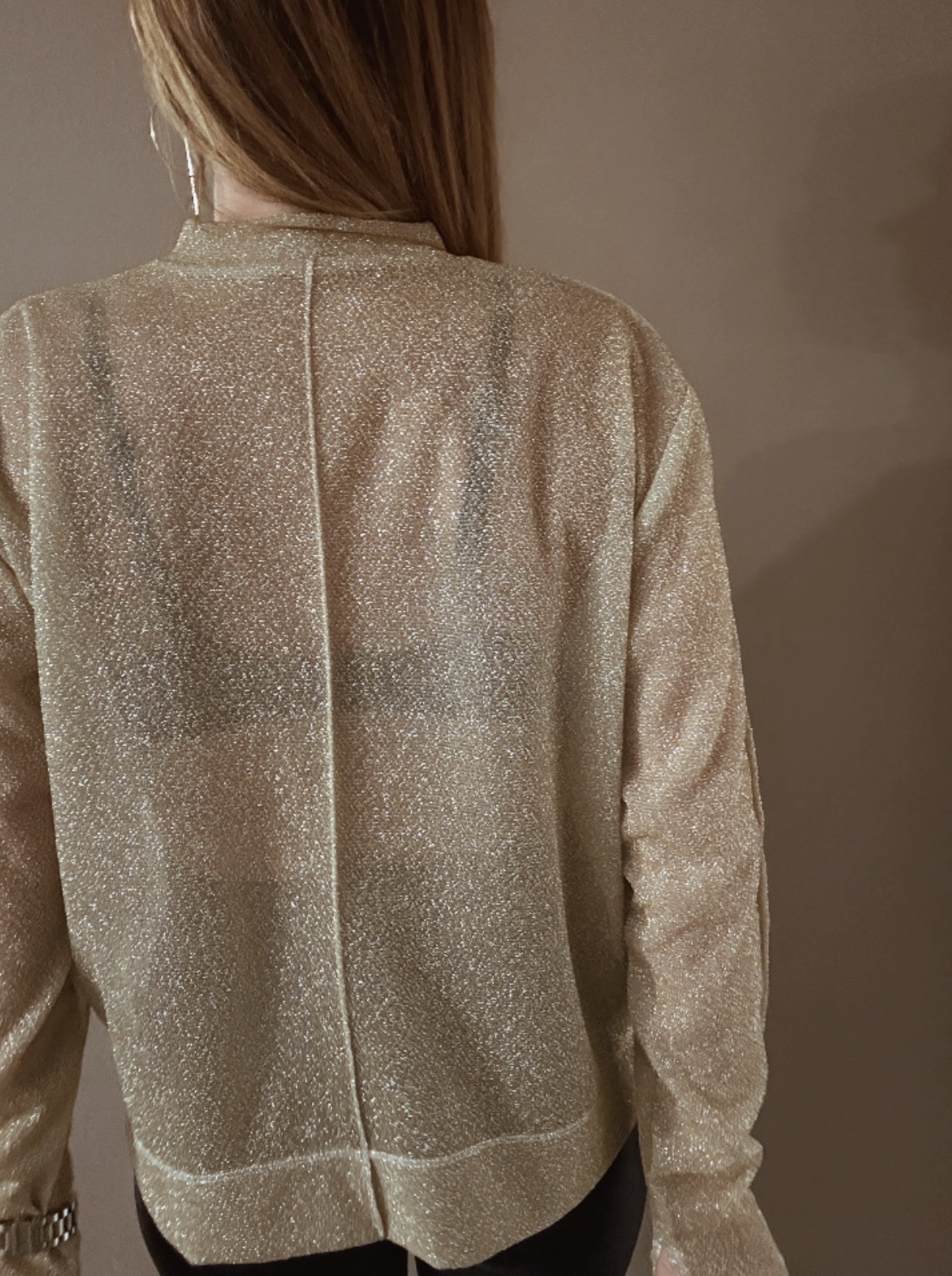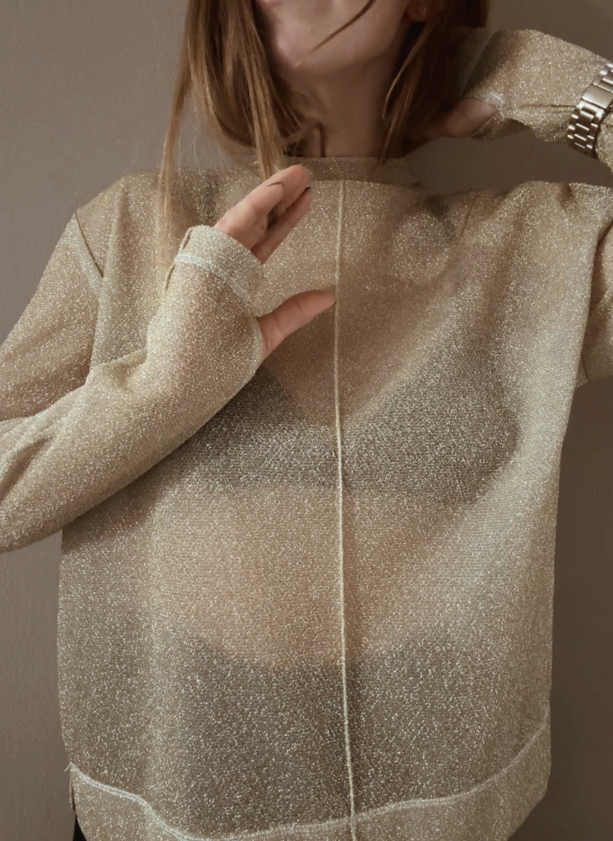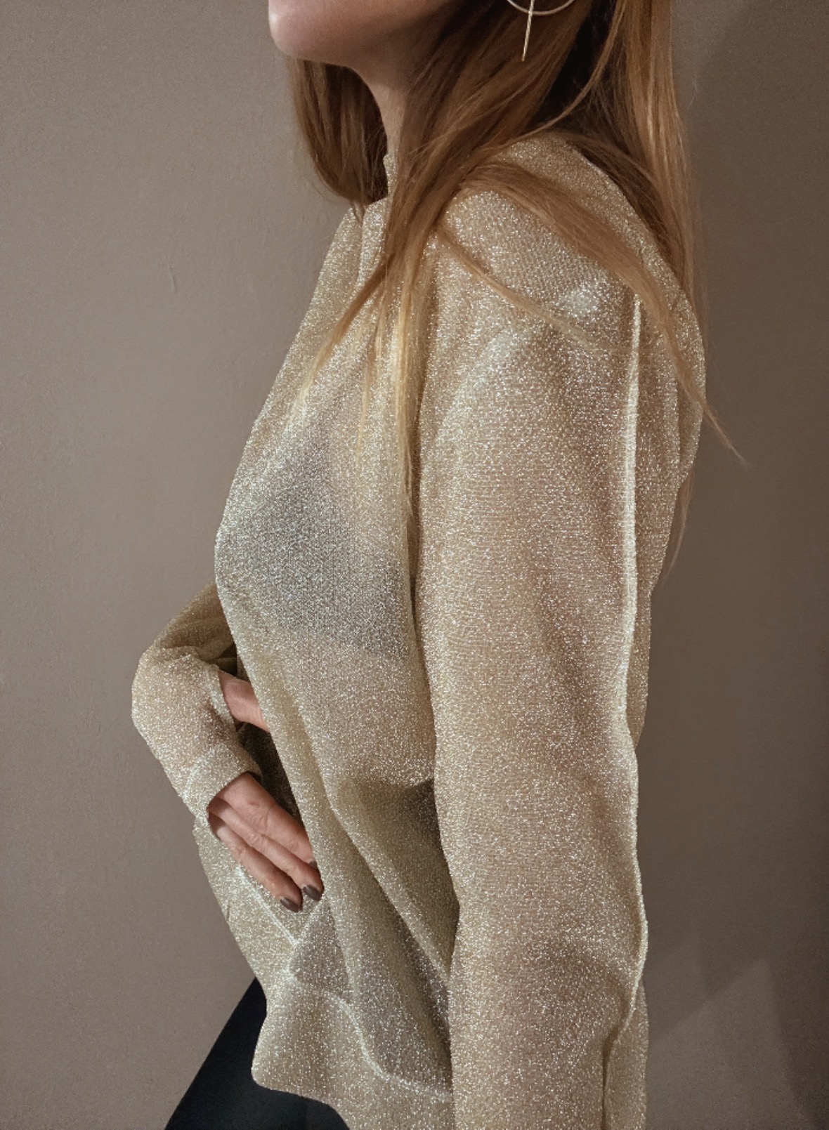Jemně průhledný top s třpytivým efektem, který chytá světlo při každém pohybu. Extra dlouhé rukávy dodávají dramatický, módní look a prodlužují siluetu. Ideální k vrstvení i jako výrazný kousek na večer.