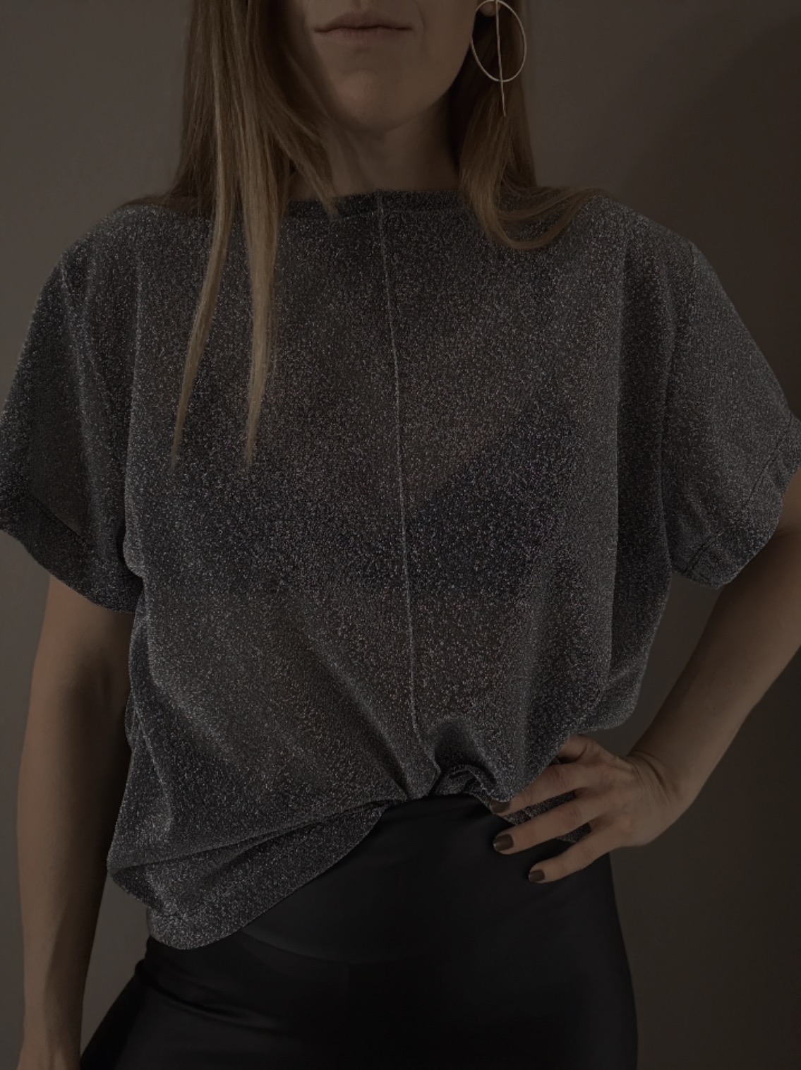 Třpytivý průhledný top s krátkým rukávem, který zaujme na první pohled. Atraktivní prošití uprostřed zvýrazňuje siluetu a dodává modelu rafinovaný detail. Perfektní volba pro výrazný, ale elegantní outfit.