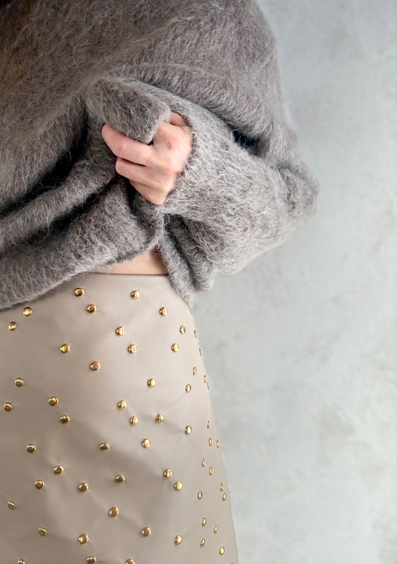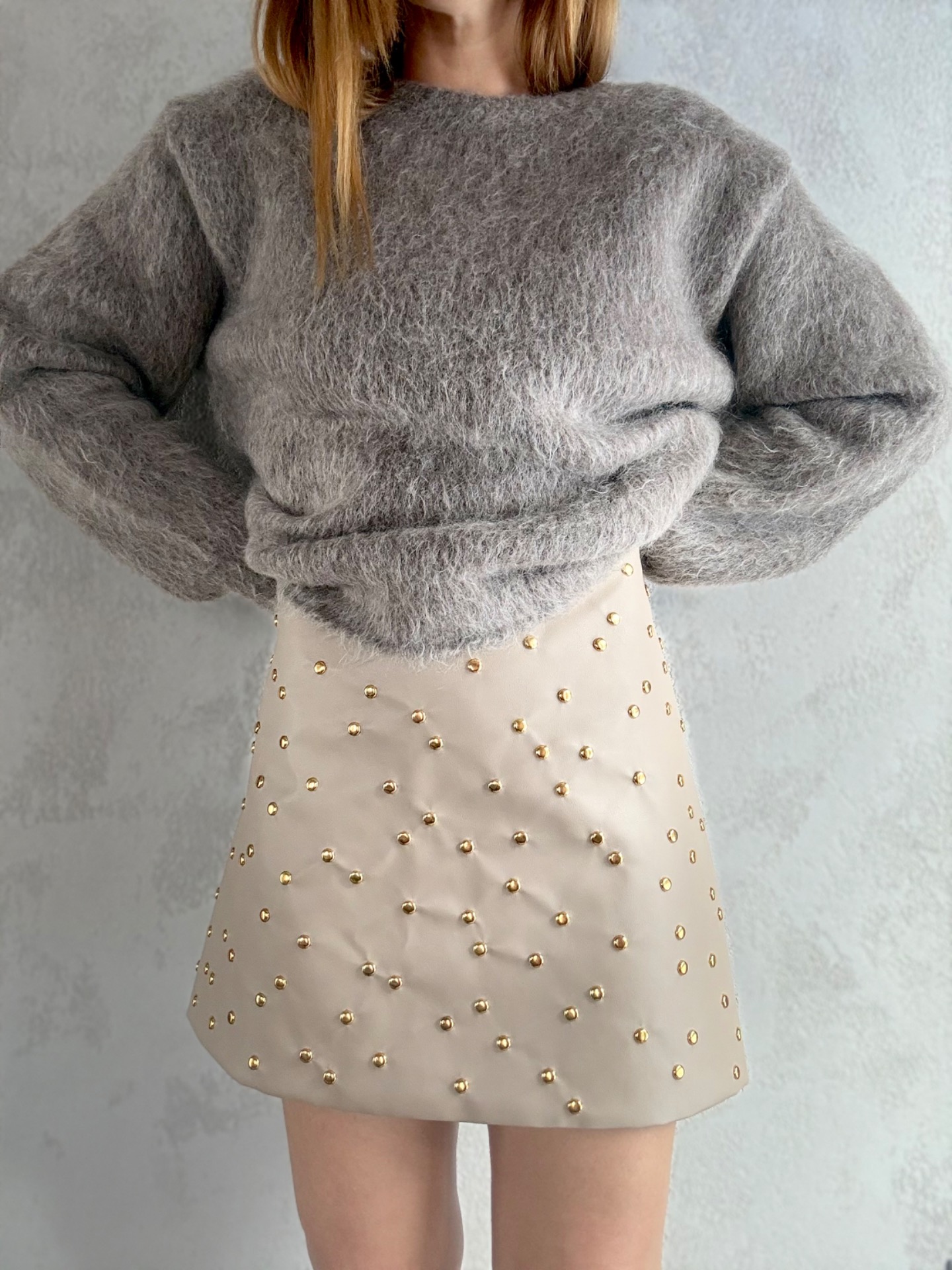 Béžová koženková sukně s ručně naraženými zlatými cvoky, která má šmrnc a sebevědomí. Podžehlená a podšitá pro perfektní tvar i pohodlí při nošení. Pro maximální pohodlí je sukně podžehlená a podšitá, takže krásně drží tvar a příjemně se nosí. Stylový kousek, který pozvedne každý outfit – od ležérního po večerní.