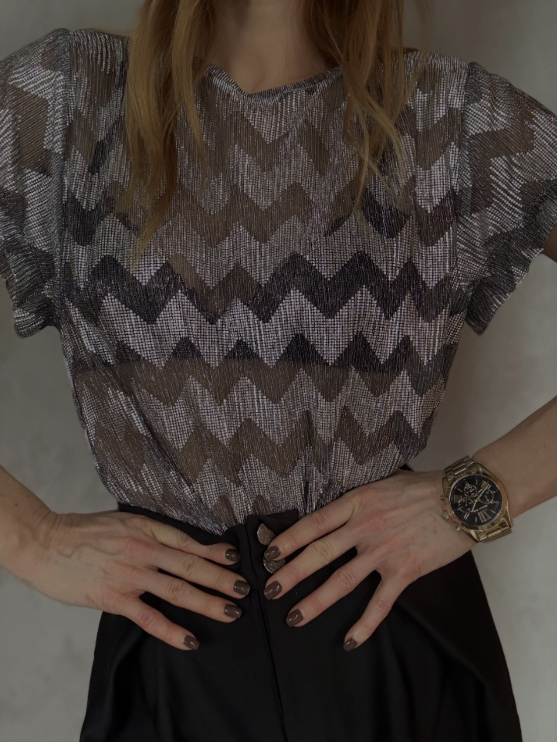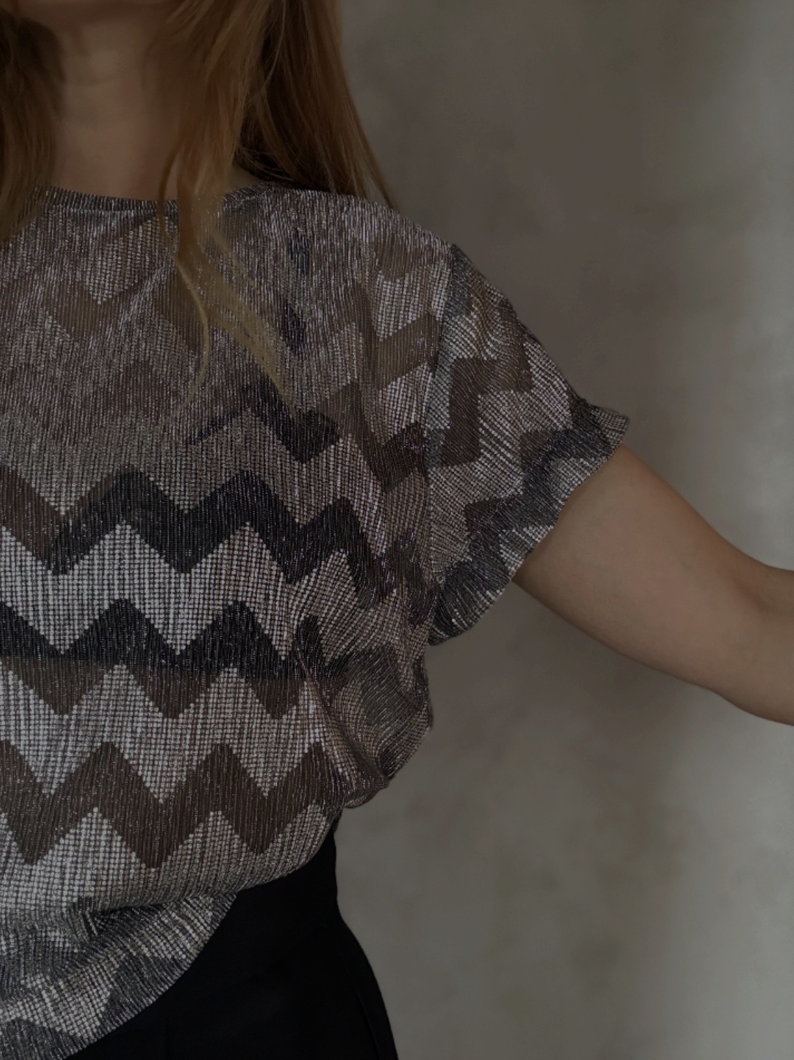 Výrazný lehký top se stříbrno-šedým cik-cak vzorem, který zaujme na první pohled. Lehoučký, jemně průhledný materiál působí vzdušně a elegantně, zatímco dekorativní prošití uprostřed krásně tvaruje siluetu. Ideální k jednoduchým kalhotám nebo sukni, když chceš nechat top mluvit za sebe.
